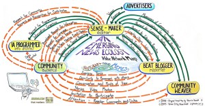 This is a map of our emerging journalism ecosystem, courtesy of the Journalism That Matters blog. What this shows is that news is no longer single-sourced. It’s not a reporter dispensing information through a video stand-up. Multiple voices have their say now: social media, blogs, expert citizens. Talk all you want but it’s useless to spend time trying to discredit one another; a source with a logo is no more authoritative than a person typing at the computer. The savvy journalist spends time pulling all these various voices together, building a niche audience’s trust by providing credible information pulled from various sources, then facilitating a conversation.