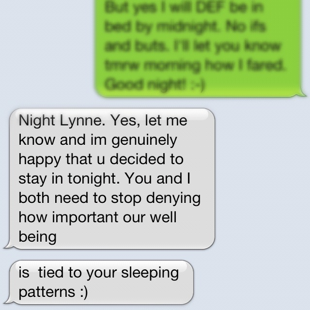 There you have it. Rather than belabor the point, I’m going to heed these words and head to bed. It’s a Friday night and temptation is out there. Thank goodness for a friend who just sent me this text: